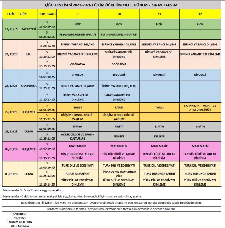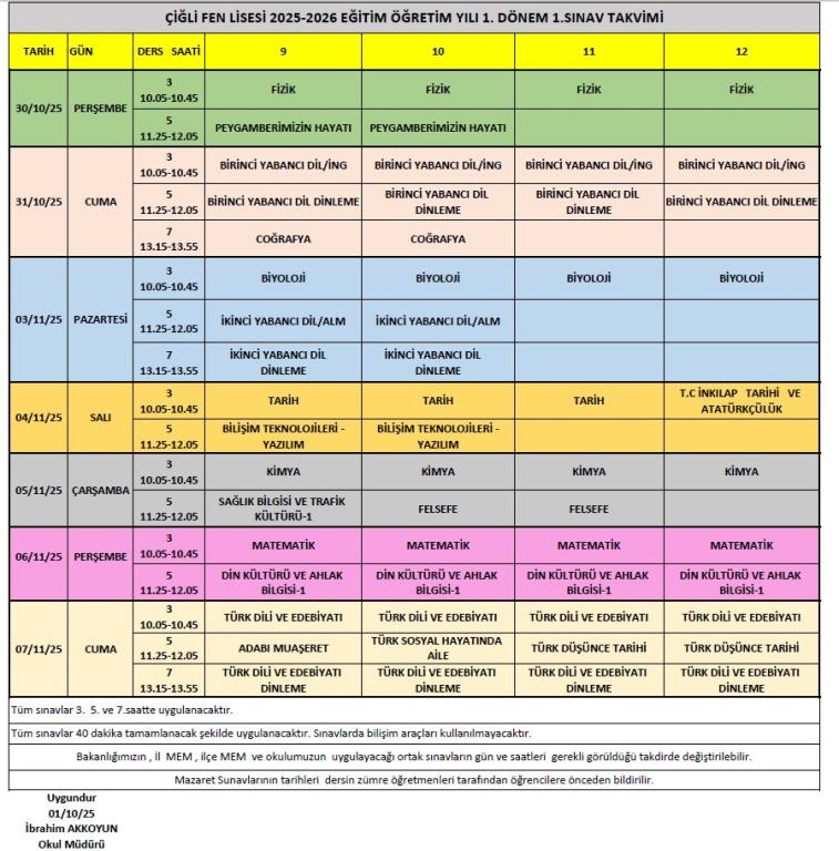 2025-2026 Eğitim Öğretim Yılı Birinci Dönem 1. ve 2. sınav tarihleri