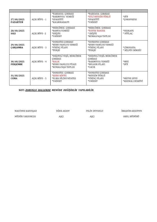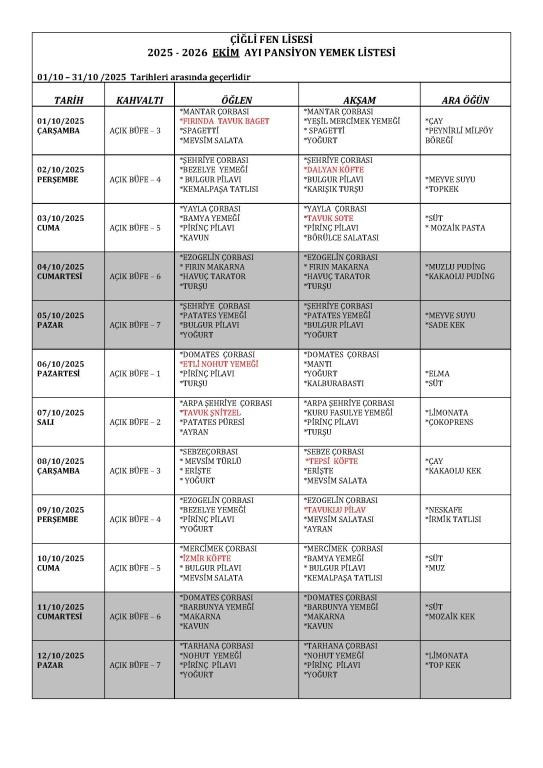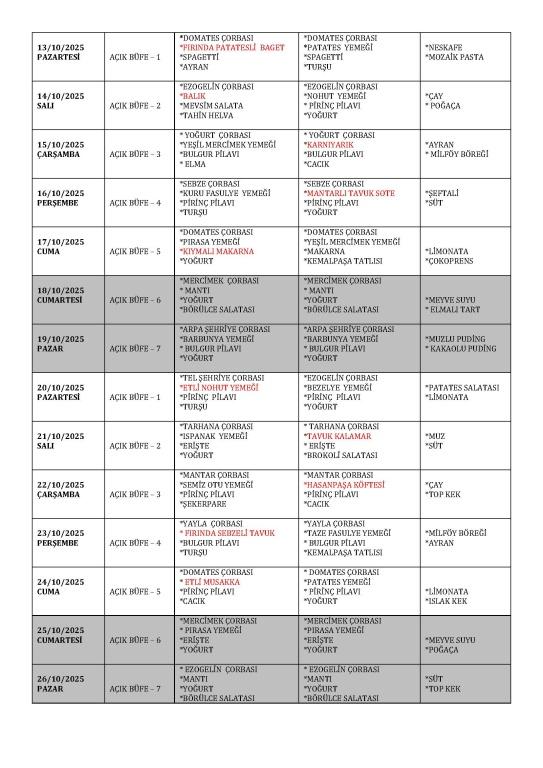 Pansiyon Yemekhanesi Ekim Ayı Yemek Listesi